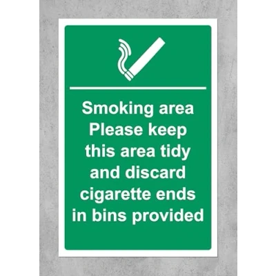 Smoking Area Cigarette Bins Provided safety sign 1.2mm Rigid plastic 300mm x 200mm Digitally printed and laminated for extra durability Drill and screw in position or use double sided tape to mount onto suitable surface.