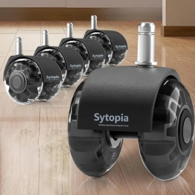 🥇 Upgraded Office Chair Wheels - Set of 5 premium swivel casters for office chairs. Universal Shaft Size of the wheels: 7/16" wide x 7/8" high (11 x 22 mm), fits up to 99% chairs (office chairs, game chairs, desk chairs), but not compatible with IKEA and Topstar chairs. 🥇 No Scratch for All Floors - Sytopia rubber casters do not require chair mats at all. The rubber wheels roll smoothly and quietly glide on your hardwood floor, carpet, tile, parquet, marble and laminate floors without causing scratches or noise.Throw away your office chair mat! 🥇 Supports 700lbs (317kg) Weight - Sytopia offers smarter weight distribution through double-wheel and more compact 50mm diameter chair wheels for total support and balance, more sturdy and durable.Protector for chair 🥇 Quiet & 360° Smooth Glide- The wheels are made of shock absorbing polyurethane. You will enjoy a quiet glide in your home and office without disturbing others! It's smooth to grab a coffee or turn around while sitting on it and gliding. 🥇 Tool Free Installation- Just take two minutes to replace the new chair wheels and enjoy the company of Sytopia chair wheels for a long time. Contact us and get refund or new replacement very quickly if you feel dissatisfied.