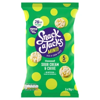 Snack a Jacks Sour Cream & Chive Multipack Rice Cakes Crisps 5x19g Snack A Jacks Sour Cream and Chive Rice Cakes are delicious snacks made with your convenience in mind Slip into your bag for on-the-go snacking or pack into your lunchbox for a lunchtime treat Popped never fried Suitable for vegetarians Contains no artificial colours or preservatives and no added MSG