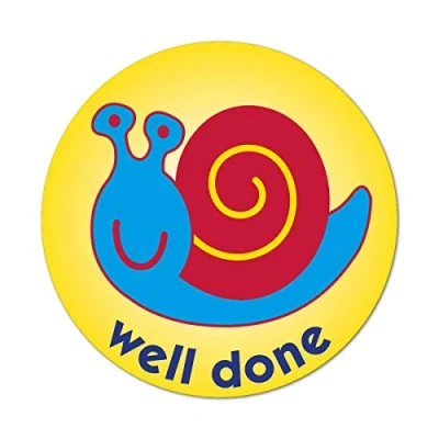 Cute snail stickers with a 'well done' Message 75 identical stickers per pack Each sticker measures 38mm in diameter