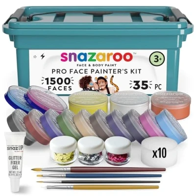 Snazaroo Face Painters Kit for Kids & Adults, 35 Pieces, 10 Colours, Brushes, Glitter Gels, Sponges, Guide, Water Based, Easily Washable, Makeup, Body Painting