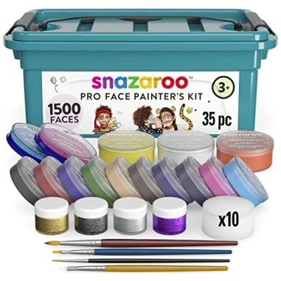 Snazaroo Professional Face Paint Kit for Kids and Adults, 35 Pieces, 15 Colours, Brushes, Glitter Gels, Sponges, Guide, Water Based, Easily Washable, Makeup, Body Painting