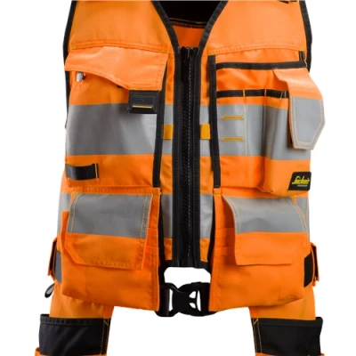 High-vis tool vest designed for practical tool carrying and storage, featuring mobile pocket, holster pockets and front tool pockets. Plenty of space for profiling.Mobile pocketIntegrated beltAdjustable shouldersInside expanderID badge for added functionalitySizes: XS-XXXLMaterial: Main: 85% polyester, 15% Cotton, 270 g/m². Reinforcement: 100% polyamide CORDURA®, 205 g/m².Machine wash 60°C. Do not bleach. Do not tumble dry. Regular ironing, steam or dry, may be performed at Low setting (110ºC, 230ºF) only. Do not dry clean.Technical Specification:Colour: Orange; Black Type: Tool Vest