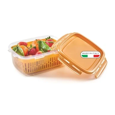 CAPACITY: 1.80 LT container ideal for storing whole or chopped fruits, vegetables, and food, preserving aroma and freshness. FRESHNESS SEAL: Equipped with an airtight seal and 4 safety locks, it preserves the properties of the food while preventing leakage and waste. Ideal for preserving freshness and flavour for longer. REMOVABLE BASKET: The perforated basket allows you to wash, drain and store food while keeping excess liquids separate. Ideal for keeping fruit and vegetables fresh for longer, preserving their texture and flavour in a practical and hygienic way. STACKABLE DESIGN: The flat lid and functional structure allow containers to be stacked safely and neatly, maximising space in the fridge, freezer or pantry for practical and efficient storage. MADE IN ITALY: 100% Made in Italy product, with high-quality technologies and design, ensuring durability and superior performance.