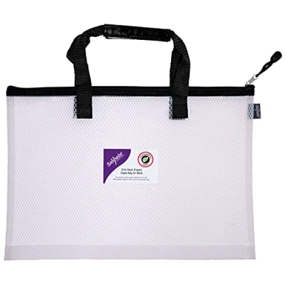 Versatile EVA Mesh book bags are ideal for filing notebooks and textbooks, as well as arts and crafts supplies, painting, sketches and other larger items High capacity A3 sized bag features a gusseted base providing additional storage for items with bulky and awkward shapes like water bottles, pencil cases and more Sturdy fabric carry-handle with hook and loop closure has a soft leather-like grip allowing you to transport contents comfortably Featuring a card holder on front, you can personalise each bag with your name and details, perfect for easy identification Made from flexible, recyclable, durable and water resistant reinforced tough mesh, the eco conscious (PVC free) bags are transparent, ideal for quickly identifying contents Multi-purpose bags with colour co-ordinated hanging loop and heavy duty metal zip combined with sewn edges for long lasting reliability