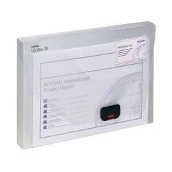 Document box for storing A4 files. Heavy gauge polypropylene welded for strength. Cutaway front for easy access. Push lock clasp for security. 2 index windows, one of which is suitable for a business card. Capacity: 35mm. Colour: clear.
