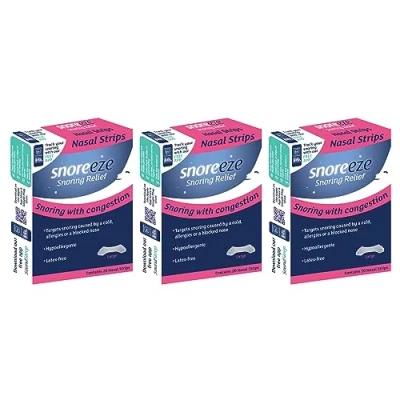 SLEEP BETTER, LIVE BETTER - Snoreeze Anti-Snoring Nasal Strips address snoring caused by a cold, allergies, or a congested nose. These Nasal Strips can help relieve snoring to provide you with a peaceful night's sleep LONG-LASTING RELIEF - The flexible bands gently open your nasal passages and improve airflow, providing effective snoring relief. The Nasal Strips are safe for your skin, hypoallergenic and latex free SNORING WITH NASAL CONGESTION - Reduce disrupted sleep with Snoreeze Anti-Snoring Nasal Strips. Wash and dry your nose. Apply a single Nasal Strip across the bridge of your nose to open the airways and improve airflow TRACK YOUR PROGRESS - Get the most out of your anti-snoring Nasal Strips with our SoundSleep App. Easily monitor snoring and breathing disruptions, track how well the anti-snoring strips work for you, and log lifestyle factors that impact your snoring— all in one app! OFFICIAL MANUFACTURER OF SNOREEZE - We’re dedicated to improving your sleep and overall health. For over 20 years, we’ve worked alongside healthcare experts to develop and refine our snoring solutions to help you sleep better