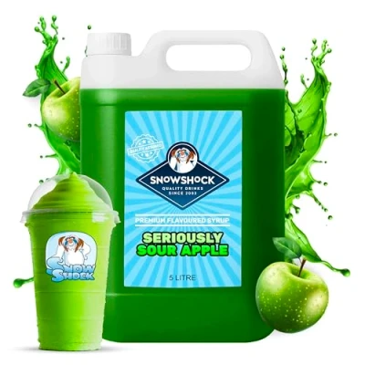 SOUR APPLE SLUSH SYRUP - Bursting with sharp, tangy sour apple flavour, this premium slush syrup creates a sweet & refreshing icy slushie that stands out, delivering rich colour, bold fruity taste & icy cold refreshment with a smooth frozen texture. 20+ SLUSH SYRUP FLAVOURS - Choose from over 20 flavours across our range including blue raspberry, cola, tiger blood, lemon & iron brew. Our slush syrup & slushie mix range suits slush machines, shaved ice, smoothies, mocktails & frozen cocktail recipes, with exciting new flavours always being added. USE IN ALL SLUSHY MACHINES - Designed for universal compatibility, this slush machine syrup works flawlessly in all commercial & home slushy machines. Trusted by thousands of UK venues for delivering a reliable freeze, smooth icy consistency & perfect slushies every time. PERFECT FOR KIDS PARTIES, HOME & TRADE - Ideal for kids parties, events, cafés, home use & busy venues, this versatile slushie mix also works brilliantly as a cocktail slush syrup for frozen drinks. Our slush syrup is easy to prepare, consistent in flavour & ideal for everything from family treats to high footfall service. LARGE 5L SLUSH MIX – LONG LASTING SLUSH SYRUP, MAKES UP TO 110 DRINKS - High yield 5 to 1 concentrate that provides excellent value, with each large 5 litre bottle producing up to 110 x 300 ml slushie or slushy servings. EASY TO USE - Simply dilute with water & pour into your slushie or slushy machine for quick, fuss free preparation. Our slush syrup keeps serving simple with no mess, no complication & smooth results every time. UK NUMBER 1 SLUSH SYRUP BRAND - With over 20 years of leading the slush industry, Snowshock is the UK’s top choice for slush syrup & slush machine syrup, trusted by thousands nationwide. Our vegan friendly brand is known for premium quality, 5 star Trustpilot service & lifetime expert support.