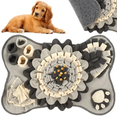 [Flower Structure & 5 Small Bowls & BB Sounders] This mat is designed a multi layer dense flower structure, which is the best place to hide treats. We also designed 5 small bowls which can hold all kinds of dog's favorite treats. We also set BB sounders on the cute paws, which can attract your dog's attention and increase the fun of foraging [Funny Pet Foraging Mat] This is a fun food puzzle toy to help dogs find snacks hidden in the mat, it helps to train your dog's sense of smell, burn up your dog's energy, reduce your dog's weight, and keep your dog busy to avoid boredom and destructive behavior [Soft & Non Slip & Safe] This sniffing mat is made of soft polyester material, very comfortable. The bottom is made of high quality non slip fabric, which is resistant to wear and tear. This soft fabric makes it very safe for dogs to sniff [Washable and Portable] The sniffing mat is very resistant to dirt. If you need to wash it, both machine and hand wash are available, and the stitching is very strong and not easy to damage. The fabric is very soft and can be folded freely for easy storage and carrying [Suitable for Small and Medium Pets] This sniffing mat measures 64x43cm, suitable for dogs/cats/rabbits of different ages, not suitable for large or strong biting dogs