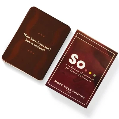 PERFECT FOR COUPLES. SO Cards More Than Friends is designed to be played one-on-one w/ your special (or potentially special) someone. Perfect couple card games, ideal intimacy deck cards for couples & for engaging in intimate couple games. TRAVEL & TRIP CARD. This deck of conversation starter cards for couples games have 47 questions, 5 non-verbal prompts, 1 blank card & 3 rule cards easily fits in your pocket, purse or fanny pack. SO Cards is the ideal choice for honeymoon card games. COUPLES CARD GAME. Looking for couple games for date night? Want relationship cards or a fun dating questions card game? You've found your ideal conversation cards with our get to know each other card games & deep questions card game! SPARK THE CONNECTION. Enjoy a magical, authentic person to person communication with this could-be intense adult dating card game. Our relationship card game is also a great date night cards to strengthen your connection & bring you closer together. DIG DEEPER. These relationship cards are more than conversation starters; the answers may surprise you about your partner (or potential partner). Our intimacy deck of cards makes a great couples games for adults. UNLEASH YOUR CURIOSITY. Discover new things about your partnerr as you dive into topics you may have never explored together. This couples questions card game is a fun way to play get to know you games for couples, encouraging a deeper connection. PERFECT ICEBREAKER FOR COUPLES. Ideal for new relationships or deepening existing ones, these cards are fun dating games for new couples. They break the ice & create a comfortable space for open dialogue, making them great for date night activities! MEMORABLE MOMENTS. Transform ordinary evenings into unforgettable experiences with this relationship card game designed for couples. The memories created will linger long after the game is over, making it perfect for couples date night activities! QUALITY TIME GUARANTEED. Set aside your devices and engage in genuine, distraction-free conversations that strengthen your bond as a couple with SO Cards. Perfect for date night ideas, these card games for adults create memorable moments together! FUN MEETS INTROSPECTION. Enjoy a blend of lighthearted & serious prompts of SO Cards for an evening filled with laughter & meaningful conversations. This deck is perfect as couples games and card games, deepening your connection!, Manufacturer: SO …