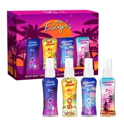 SO…? SUMMER ESCAPES - Unveil the essence of summer with the fruity and floral body mist scents inspired by the heat of the sun, the feel of the sand and the smell of the ocean breeze. Allowing you to relive the sun-soaked season whenever & wherever you are! THE PERFECT GIFT - Treat someone special to the ultimate sensory escape with the So…? Escapes Grande Mini Mist Gift Set. This gift set is the ideal gift for women, mums, grans, girls, teenage girls and stocking fillers at Christmas! It contains 4x travel-size body mists in 1 x 50ml Ibiza Dreams, Bali Breeze, Mykonos Nights and Hawaiian Honey. HOW MANY SPRAYS? - Each 50ml So…? Body Mist contains over 350 sprays, representing 35 days’ supply based on 5 sprays 3 times a day. Scent should last for an estimated 6 hours after spraying. RECYCLABLE AND CRUELTY FREE - All So…? body mist sprays are vegan, cruelty-free and come in a recyclable plastic (PET) bottle. WHO ARE SO....? - So…? Fragrance is the #1 best-selling self-select fragrance brand in the UK. Our mission is to offer high quality fragrances that suit all tastes and budgets, as we believe that beauty should be inclusive and available to all!