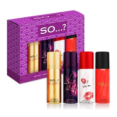 FRAGRANCE NOTES - Fruity, Citrus, Floral, Gourmand, Vanilla SO…? ICONIC - Immerse yourself in the timeless allure of our So…? Iconic scents, a tribute to our legacy fragrances that embody a spirit of bold confidence. Discover the beauty of choice as you explore and adapt your fragrance throughout the day. MINI GALORE WOMENS GIFT SET - Our So…? Iconic 4x50ml mini galore gift set is the perfect gift for women, girls, teenage girls and stocking fillers at Christmas. It contains 4x travel-size body mists in 1 x 50ml So..? Sinful, So…? Kiss Me, So…? Exclusive and So…? Red. RECYCLABLE AND CRUELTY-FREE - So…? Mini Galore are vegan, cruelty-free and come in recyclable aluminium cans. WHO ARE SO....? - So…? Fragrance is the #1 best-selling self-select fragrance brand in the UK. Our mission is to offer high quality fragrances that suit all tastes and budgets, as we believe that beauty should be inclusive and available to all!