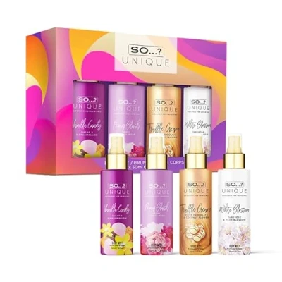 FRAGRANCE NOTES - Sweet, Vanilla, Citrus, Woody, Amber, Oriental, Fruity, Floral. LAYER LIKE A PLAYER - Looking for a perfume that is unique to you? Say hello to our So…? Unique body mist range. Each scent can be worn alone, or adapted and blended for every mood, schedule and occasion. THE PERFECT GIFT - Our So…? Unique gift set is the ideal gift for women, girls, teengage girls and stocking fillers at Christmas! Containing a 4x50ml body mist fragrance sprays. RECYCLABLE AND CRUELTY FREE - All So…? Body mist sprays are proud to be cruelty free and packaged in recyclable packaging WHO WE ARE - So…? Fragrance is the #1 best-selling self-select fragrance brand in the UK. Whether you’re the boardroom girl boss, looking for a holiday essential, have pamper night desires or are in a floral Sunday mood - So...? has a range of perfumes, body mists and body care that suits all tastes & budgets.