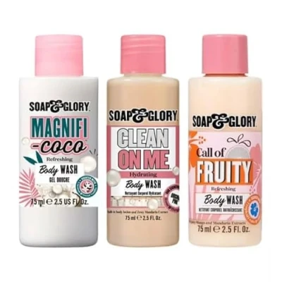 GIFT SET CONTENTS: Three luxurious 75ml mini body washes featuring Soap & Glory's most popular fragrances - Original Pink, Magnificoco, and Call of Fruity UNIQUE FRAGRANCES: Original Pink with rose & bergamot, Magnificoco with coconut & vanilla, and Call of Fruity with tropical fruits & hibiscus scents MOISTURISING FORMULA: Enriched with glycerin and nourishing ingredients to leave skin feeling soft and beautifully scented whilst cleansing EASY APPLICATION: Simply massage onto damp skin, work into a creamy lather, and rinse thoroughly for a refreshing shower experience COMPACT SIZE: Perfect travel-sized collection in a beautifully presented gift set, ideal for trying multiple signature scents