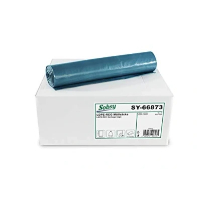 With the blue garbage bags made of LDPE regenerated, type 100, you get very strong and resilient garbage bags The bags are suitable for a lot of heavier waste such as can arise in building cleaning, but also in landscaping, industry, clearing out and moving; The capacity of the blue garbage bags is about 120 liters with a dimension of 700 x 1,100 mm One sales unit (PU) contains 10 rolls x 15 pieces (150 pieces / box)