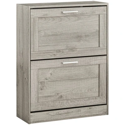 General description This modern design 2 drawers shoe cabinet is a great addition to your home, ideally located in a hallway or porch. It provides ample storage with a shoe storage compartment featuring 2 flip-drawers, each with 2 rows of spaces. The panel in the flip-drawer is removable, allowing for flexibility with different shoe sizes. The top of the shoe cabinet is perfect for storing items like keys and wallets or displaying photos and plants. Additionally, it comes with an anti-tipping device for enhanced stability and safety, making it suitable for narrow corridors. Technical specifications Material: Particle board, MDF Dimensions: W60 x D23 x H79 cm Weight: 12 kg Load capacity: 20 kg Installation Item comes in a flat pack and requires self-assembly Detailed instructions supplied Other information The decorative elements are not included in the delivery