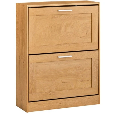 General description This modern design 2 drawers shoe cabinet is a great addition to your home, ideally located in a hallway or porch. It provides ample storage with a shoe storage compartment featuring 2 flip-drawers, each with 2 rows of spaces. The removable panel in the flip-drawer allows for accommodating shoes of different sizes. The top of the shoe cabinet is perfect for storing items like keys and wallets or displaying photos and plants. Additionally, it comes with an anti-tipping device for enhanced stability and safety, making it suitable for narrow corridors. Technical specifications Material: Particle board, MDF Dimensions: W60 x D23 x H79 cm Weight: 12 kg Load capacity: 20 kg Installation Item comes in a flat pack and requires self-assembly Detailed instructions supplied Other information The decorative elements are not included in the delivery