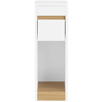 SoBuy FBT163-WN Narrow Bedside Table with Hidden Storage, Light Wood and White Style, 60 cm Elegant Design and Space-Saving : This bedside table combines a white finish and light wood texture in a minimalist and modern style. With a width of only 20 cm, it fits perfectly in narrow corners or small spaces, ideal for the bedroom, living room or office. Clever and Functional Storage : The top shelf is movable, allowing you to hide cables, headphones or personal items for more discretion. The open space is perfect for keeping cups, books or small daily items within easy reach. Compact and Stable Structure : Thanks to its reduced dimensions (20 x 35 x 60 cm), it offers a total load capacity of 20 kg (10 kg on top, 3 kg for the shelf, 2 kg for the drawer, 5 kg at the base). The base is designed to fit against the wall despite the skirting board, thus improving stability. Floor Protection and Easy Maintenance : Felt pads are provided to protect the floor from scratches. The piece of
