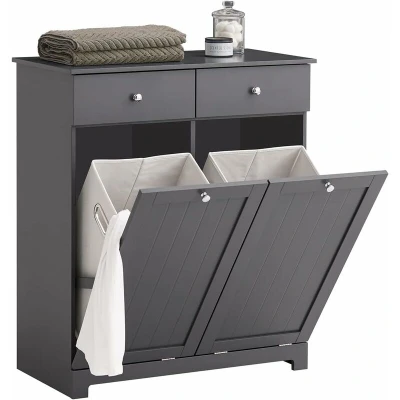 ManoManoGeneral description Modern design laundry cabinet storage cabinet is a good choice for your home. It features 2 drawers, 2 doors, and 2 concealed laundry baskets, making it a practical addition to any bathroom. The dirty laundry can disappear behind the closed doors, while the 2 laundry baskets provide ample storage space. The top of the cabinet is ideal for storing items you might need within reach or for displaying decorative pieces. This space-saving storage solution will help keep your bathroom tidy and organized, fitting perfectly with any style of decor. Technical specifications Material: MDF Dimensions: W78 x D38 x H91 cm Weight: 25 kg Load capacity: 70 kg Installation Item comes in a flat pack and requires self-assembly Detailed instructions supplied Other information Handles in 2 colors (black and silver) are included in the package The decorative elements are not included in the delivery