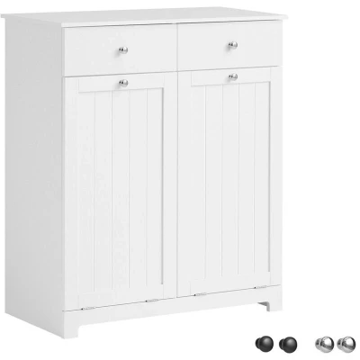 ManoManoGeneral description White Bathroom Laundry Cabinet will blend perfectly with your modern or traditional decor. It features 2 drawers, 2 doors, and 2 concealed laundry baskets, making it a practical addition to any bathroom. The dirty laundry can disappear behind the closed doors, providing a space-saving storage solution that will help keep your bathroom tidy and organized. Technical specifications Material: MDF, particle board, non-woven fabric Dimensions: W78 x D38 x H90 cm Weight: 27 kg Load capacity: 70 kg Installation Item comes in a flat pack and requires self-assembly Detailed instructions supplied Other information The decorative elements are not included in the delivery
