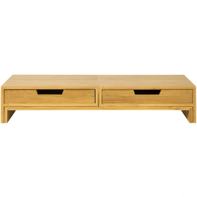 General description This SoBuy Bamboo Monitor Stand is designed to accommodate two monitors, providing an innovative and modern solution for your workspace. The stand features two rotatable and adjustable drawers, allowing you to customize the placement of your monitors while keeping your desk organized. It raises your screens to the perfect height, making it ideal for laptops, computers, and TVs. Technical specifications Dimensions: W60-108 x D22 x H11 cm Weight: 5 kg Load capacity: 25 kg Material: Bamboo, Varnished Installation No assembly required; the stand comes fully assembled and ready to use. Usage Ideal for raising screens to improve visibility and reduce neck and back strain. Provides additional horizontal surface space for laptops, keyboards, or other accessories. Two drawers offer ample storage for organizing your desk items. Other information