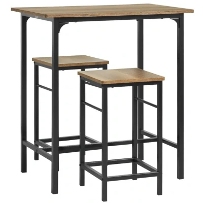 General description This 3 Pieces Bar Set, consisting of one bar table and two stools, is the perfect addition to any family home. With a modern design and a strong metal frame, it offers a stable structure. Made of high-quality particle board with a wooden effect and a black powder-coated steel frame, this dining set is both sturdy and stylish. It serves as an excellent solution for the kitchen, living room, or bar, providing a practical and fashionable space-saving option for dining and socializing with friends and family. Technical specifications Material: Particle board, metal Table Dimensions: W80 x D50 x H87 cm Stool Dimensions: W32 x D32 x H57 cm Set Weight: 15 kg Load capacity: Table: 75 kg; Stool: 120 kg Installation Item comes in a flat pack and requires self-assembly Detailed instructions supplied Other information The decorative elements are not included in the delivery