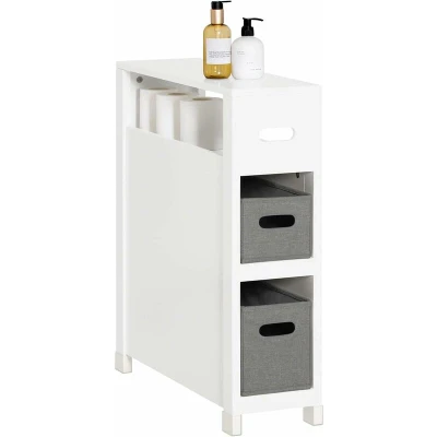 SoBuy BZR83 W, Narrow Bathroom Cabinet Storage Toilet Paper Roll Holder with 2 Fabric Baskets