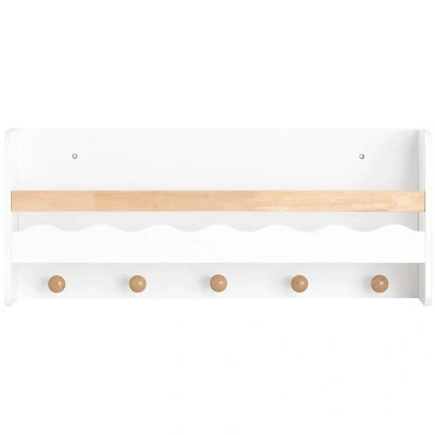 General description The SoBuy Children Wall Mounted Storage Shelf KMB78-W features a modern design that is perfect for children's rooms, playrooms, living rooms, and kindergartens. This stylish shelf maximizes room space while providing ample storage for books, toys, and more. The wooden bar prevents items from falling, and five hooks are ideal for hanging clothes, hats, and school bags. The wave-shaped panel adds a fun touch, while rounded corners ensure safety for children. Made of high-quality MDF with a white lacquer finish and a rubber wood bar with varnished coating, this shelf is both sturdy and stable. Technical specifications Material: MDF, rubber wood Dimensions: W73 x D15 x H30 cm Weight: 4 kg Load capacity: 25 kg (Shelf: 10 kg; Each hook: 3 kg) Installation Item comes in a flat pack and requires self-assembly Detailed instructions supplied Usage Ideal for organizing children's rooms, playrooms, and living spaces Can be combined with the children book shelf KMB77-W for a
