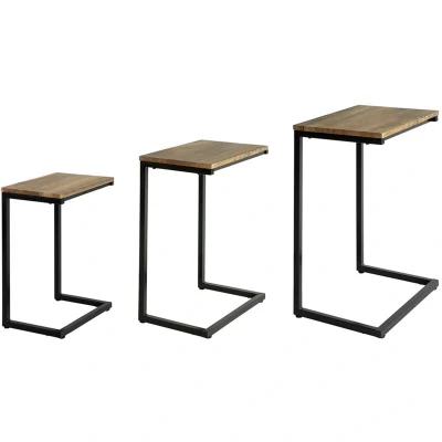 The set features three beautifully crafted tables, each boasting a distinct size to suit various needs. Their sleek, contemporary design incorporates a natural wooden effect finish on premium MDF, complemented by a robust black powder-coated steel frame. This combination not only enhances their visual appeal but also ensures durability and stability, allowing them to stand the test of time while adding character to your home.