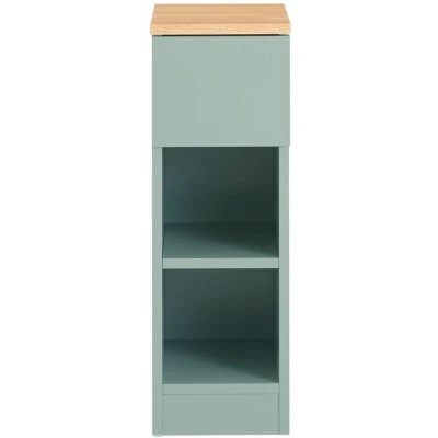General description Modern design side table in green and natural color will bring a fresh and natural look to your room, as well as keep your room nicely organized. It is great to be used as a sofa side table or bedside table for easy access to your essentials. The table offers ample storage space for books, magazines, remote controls, glasses, and other small items, keeping your room tidy and organized. A closed drawer provides additional storage for your personal items, while two storage compartments beneath the drawer and the top shelf offer extra space for display and organization. The shelf in the open compartment is adjustable in three heights, allowing you to customize it to meet your needs or simply remove it for more space. Practical and space-saving, this table is a good addition to any room, especially in corners or gaps due to its compact width of 20cm. Technical specifications Material: MDF, rubber wood Dimensions: W20 x D35 x H61 cm Weight: 8.5 kg Load capacity: 20 kg