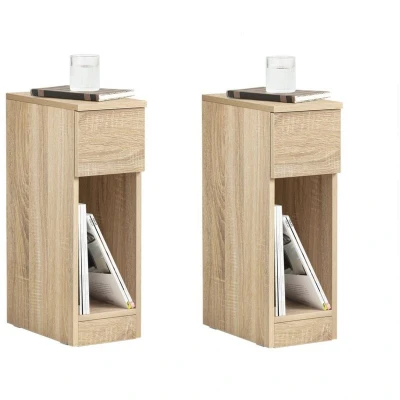 General description This set of 2 bedside tables creates a distinctive and modern atmosphere for your home. They can be used as sofa side tables or bedside tables, providing easy access to your essentials. With ample storage space for books, magazines, remote controls, glasses, and other small items, these tables help keep your room tidy and organized. Each table features a slide-out drawer and additional storage beneath the drawer and on the top shelf, making them practical and space-saving additions to any room. Their elegant and simple design matches any home decor perfectly, and they are available in four colors: white & natural, black & natural, grey & natural, and natural. Technical specifications Material: Particle board, MDF Dimensions: W20 x D35 x H60 cm Weight: 7.3 kg each Load capacity: 20 kg each Installation Item comes in a flat pack and requires self-assembly Detailed instructions supplied Other information The decorative elements are not included in the delivery