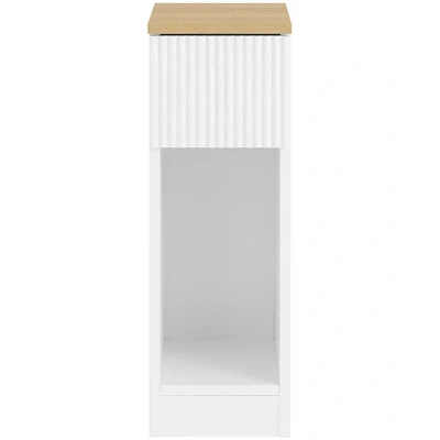 SoBuy FBT111-W Narrow Bedside Table with Drawer and Shelf, White, 20 x 35 x 60 cm Sleek and elegant design : With a width of only 20 cm, this bedside table fits perfectly in small spaces while adding a touch of modernity to your interior. Its drawer with a wavy front adds an artistic and contemporary note, ideal for both the bedroom and the living room. Clever daily storage : Equipped with a discreet drawer and an open shelf, this table offers practical storage space for your essentials: books, glasses, remote control, or decorative items. Keep everything within reach without cluttering your room. Design tailored to your space : The base is specially designed to go around skirting boards, allowing the table to be placed flush against the wall for maximum space-saving and better stability. Sturdy structure and meticulous finishes : Made of E1 grade MDF and particleboard, this table ensures sturdiness and durability. It supports up to 20 kg in total and stands on felt pads that protect