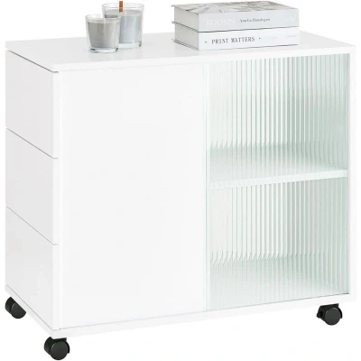 General description The SoBuy Mobile Storage Cabinet Sofa Side Table End Table is a modern design multipurpose storage solution on wheels, providing ample storage space for your needs. With a stylish appearance, it fits perfectly with any decor style while keeping your room tidy and organized. Technical specifications Material: Particle board, glass Dimensions: W70 x D35 x H61 cm Weight: 23.7 kg Load capacity: 53 kg Installation Item comes in a flat pack and requires self-assembly Detailed instructions supplied Usage Ideal for storing items within reach or for display 3 drawers and 2 storage compartments for books, magazines, etc. Can be used as a file cabinet or printer stand in the study room and office Mounted on 5 sturdy wheels (2 with brake) for easy mobility