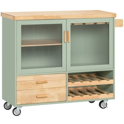 General description This modern design kitchen island offers versatile storage solutions and durable usage. The solid rubber wood worktop provides ample space for food preparation and storage. Featuring 2 glass doors, it showcases your collection of cutlery, plates, and glassware while effectively preventing dust. Additionally, it includes 2 wine racks and a wine glass holder, accommodating up to 10 wine bottles and 8 wine glasses. With 2 closed drawers, it offers generous storage space while keeping items out of sight. The towel rack is perfect for hanging towels, and with 4 wheels (2 with brakes), you can easily move the cabinet around your home. Technical specifications Material: MDF, rubber wood Dimensions: W109 × D40 × H92 cm Worktop size: 100 × 40 cm Weight: 41.5 kg Load capacity: 90 kg Installation Item comes in 2 flat packs and requires self-assembly Detailed instructions supplied Other information The decorative elements are not included in the delivery