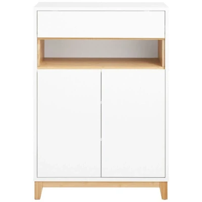 General description This modern design storage cabinet is suitable for various locations, including the hallway, kitchen, dining room, and living room. It features a drawer, an open storage compartment, and 2 doors, providing ample storage space. The cabinet includes 2 adjustable shelves behind the doors, allowing you to customize the height to meet your needs or remove them entirely. The top of the cabinet is perfect for storing items within reach or displaying decorative pieces. The hidden handles create a cleaner look, while the anti-tipping device ensures stability and safety. Multifunctional and fashionable, it can serve as a shoe cabinet, cupboard, sideboard, or storage display cabinet, blending seamlessly with any home decor. Technical specifications Material: MDF, bamboo Dimensions: W60 x D34 x H85 cm Weight: 24.5 kg Load capacity: 80 kg Installation Item comes in a flat pack and requires self-assembly Detailed instructions supplied Other information The decorative elements