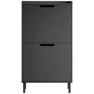 General description Modern design shoe cabinet in black that blends perfectly with any home decor. Ideally located in a hallway or porch, this unit offers ample storage with a shoe storage compartment featuring 2 flip-drawers. The cut-out grip handles on the flip-drawers allow for easy opening. The top of the shoe cabinet is perfect for storing items like keys and wallets or for displaying photo frames and plants. With a depth of 19cm, this shoe cabinet is narrow enough to fit even in small corridors, helping to keep your halls and entryway organized. Technical specifications Material: MDF, metal Dimensions: W50 x D19 x H90 cm Weight: 11.7 kg Load capacity: 16 kg Installation Item comes in a flat pack and requires self-assembly Detailed instructions supplied Other information The decorative elements are not included in the delivery
