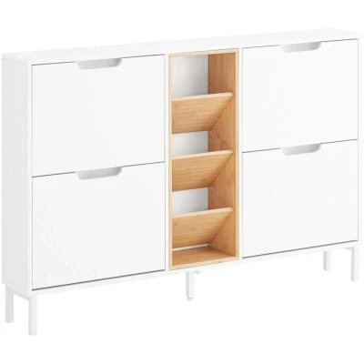 General description This modern design shoe cabinet in white and natural color will match any home decor perfectly. Ideally located in a hallway or porch, this unit comes with plenty of storage, providing a shoe storage compartment of 4 flip-drawers. The cut-out grip handles on the flip-drawers make them easy to open. Additionally, 3 open shelves in the middle offer extra storage space, ideal for storing slippers. The top of the shoe cabinet is perfect for keeping items like keys and wallets within reach, or for displaying photo frames and plants. Technical specifications Material: MDF, bamboo, metal Dimensions: W126 x D19 x H85 cm Weight: 26.2 kg Load capacity: 39 kg Installation The item comes in a flat pack and requires self-assembly. Detailed instructions are supplied. Other information The decorative elements are not included in the delivery. The cabinet features an anti-tipping device, ensuring great stability and safety. With a depth of 19 cm, the shoe cabinet is narrow enough