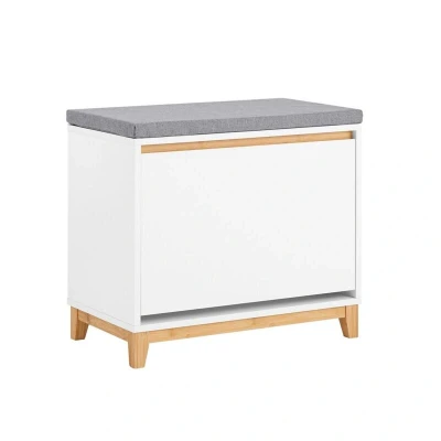 General description This modern design shoe cabinet features a soft padded cushion, making it an excellent choice for your hallway, living room, or bedroom. It offers convenient storage for several pairs of shoes in a handy flip-down section beneath the cushioned seat area. The removable boards in the flip-drawer allow for adjustable spacing to accommodate different shoe sizes. The removable seat cushion provides comfort while putting on and taking off shoes, helping to keep your hallway or porch tidy by hiding away your footwear. Technical specifications Material: MDF, bamboo Dimensions: W60 × D34 × H55 cm Weight: 15 kg Load capacity: 120 kg Installation Item comes in a flat pack and requires self-assembly Detailed instructions supplied Other information The decorative elements are not included in the delivery