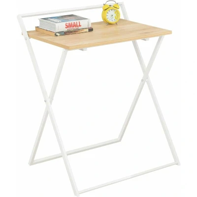 General description This foldable desk is designed with a modern and compact style, making it an excellent choice for smaller rooms. It is practical and convenient, allowing you to fold it up when not in use to save space. This desk is ideal for use as a laptop desk, writing desk, or even as a side table for coffee, snacks, and more. Made from high-quality MDF with a wooden effect and a white powder-coated steel frame, it boasts a fashionable appearance that fits perfectly with any home decor. Technical specifications Material: MDF, metal Dimensions: W63 x D45 x H77 cm Weight: 4.7 kg Load capacity: 50 kg Installation No assembly required Ready to use: just unpack the package and unfold the desk to create your own workspace Other information The decorative elements are not included in the delivery