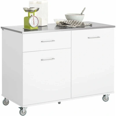 General description This modern design kitchen trolley is perfect for various storage needs and durable usage. The worktop, made of high-quality stainless steel and MDF, offers ample space for food storage and preparation. With a closed drawer and two closed doors, it provides significant storage while effectively preventing dust and ensuring privacy. The adjustable shelves behind the doors can be set to three different heights, allowing you to customize the space according to your needs. Equipped with five wheels (two with brakes), this trolley can be easily moved around your kitchen, adding both style and functionality to your home. Technical specifications Material: MDF, particle board, stainless steel Dimensions: W120 x D56 x H90 cm Weight: 54 kg Load capacity: 143 kg Installation Item comes in 2 flat packs and requires self-assembly Detailed instructions supplied