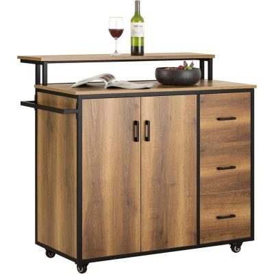 General description This modern extraordinary kitchen trolley is designed for various storage needs and durable usage. It features practical design details, including a towel holder and a top shelf, making it a well-thought-out addition to your kitchen. With 2 compartments behind the doors and 3 drawers, you can store plenty of utensils. The fashionable color mix of vintage brown and matte black gives this kitchen cart a unique look that will impress your guests. With 4 casters, you can easily move the trolley around your kitchen, enhancing both style and functionality. Technical specifications Material: Particle board, MDF, metal Dimensions: W113 x D69 x H106 cm Weight: 56.15 kg Load capacity: 75 kg Item comes in 2 flat packs and requires self-assembly Installation Detailed instructions supplied for assembly Other information The stools and decorative elements in the picture are not included
