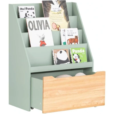 General description Modern design children bookcase in light green and natural color is a real eye-catcher in any room. An ideal addition to children’s rooms and playrooms, this bookcase features 4-tier shelves that are perfect for storing books of varying sizes and thicknesses. The large-capacity storage chest provides ample space for toys, books, and other items, and it is equipped with 4 wheels for easy mobility. Technical specifications Material: MDF, rubber wood Dimensions: W62 x D30 x H80 cm Weight: 15.8 kg Load capacity: 23 kg Installation Item comes in a flat pack and requires self-assembly Detailed instructions supplied Usage Suitable for children ages 3 and up, this bookcase can help your kids develop a good habit of organizing. It is sturdy and durable, made with environmental protection paint, and features an anti-tipping device to ensure stability and safety, making it an ideal choice for daycare, classrooms, and children's rooms.