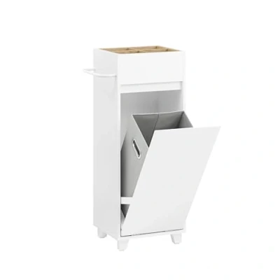[Multifunctional Bathroom Furniture with Integrated Laundry Basket]: This practical bathroom laundry cabinet comes with a removable laundry basket, perfect for collecting clothes in the bathroom. The spacious laundry bag is easy to remove, making it ideal for everyday use [Open Compartments for Order & Style]: Four open compartments above provide plenty of storage space for toiletries, bottles, or bathroom accessories – a smart bathroom storage unit that keeps everything within reach, even in compact spaces [Convenient Side Towel Holder]: Designed with an integrated towel holder, this slim bathroom cabinet is perfect for drying towels or delicate clothing, saving space while keeping your bathroom neat and organized [Durable & Moisture-Resistant with Silicone Foot Pads]: Each leg is fitted with silicone foot pads to protect floors from water damage and ensure durability, making this bathroom storage cabinet ideal for humid environments [Part of a Modular Bathroom Storage Set]: Combine this laundry cabinet with other bathroom furniture such as an under sink bathroom cabinet, tall cabinet, or wall cabinet for a coordinated and functional bathroom storage solution
