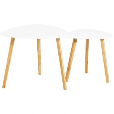 Constructed from durable MDF with a white lacquered finish, the tabletops are designed to resist scratches, ensuring long-lasting use. The legs are crafted from natural bamboo and complemented with a protective varnish for added durability. Each table is equipped with soft pads on the feet to prevent scratches on your floors, making them a practical addition to your home that does not compromise on style.