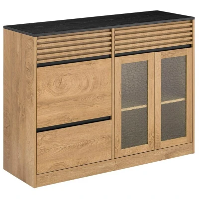 General description This modern design storage cabinet is suitable for various locations, including the kitchen, dining room, and living room. It features a top surface ideal for displaying items or keeping essentials within reach. The cabinet includes three slide-out drawers that provide ample storage space for personal items, while the handleless design adds a simple and elegant touch. The drawers are decorated with stripes, enhancing the visual appeal and allowing for integration into various interior styles. Two clear glass doors on the right effectively prevent dust while showcasing your collection of cutlery, mugs, books, potted plants, and picture frames. Additionally, a door on the left is perfect for placing microwave ovens and other electrical appliances, with a specially reserved hole on the back for electrical appliance plugs. Technical specifications Material: MDF, particle board, glass Dimensions: W112 × D40 × H89 cm Weight: 43.9 kg Load capacity: 87 kg Installation Item
