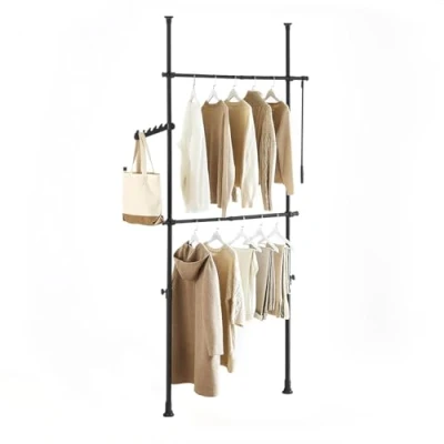 [PRODUCT INFORMATION] Made from sturdy iron tubes and durable plastic connectors. Dimensions: W(75–126) x H(200–295)cm. Weight: 3.5kg. Load capacity: up to 25kg. Package size: L93 x W17x H12cm. [VERSATILE TELESCOPIC CLOTHES RAIL SYSTEM] Equipped with 2 adjustable poles and 2 hanging rails, this system allows you to create a customizable open wardrobe. Ideal for use in bedrooms or walk-in closets without permanent installation. [HEAVY DUTY CONSTRUCTION AND FLEXIBLE APPLICATION] The strong iron frame supports up to 25kg, making it a reliable clothes hanging solution. The telescopic width (75–126cm) and height (200–295cm) can be easily adjusted to fit different room layouts. [CLOSET ORGANIZER WITH HANGING HOOKS] Features side hooks for hanging hats, coats, scarves, ties, and bags — maximizing storage in compact spaces. [EASY NO-TOOLS ASSEMBLY] No drilling required — simply extend and fix in place. Delivered in a compact flat-pack with clear illustrated instructions for quick and safe setup. Protects your walls and ceiling while keeping your room neat and organized.