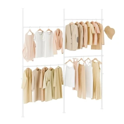 [PRODUCT INFORMATION] Made from durable metal tubes and sturdy plastic connectors. Dimensions: W(124–226) x H(200–295)cm. Weight: 5.6 kg. Load capacity: 65 kg. Package size: L93 x W17.5 x H15 cm. [VERSATILE TELESCOPIC CLOTHES RAIL SYSTEM] Featuring 3 adjustable poles, 4 hanging rails, allowing you to create a customizable open wardrobe. Perfect as a heavy-duty clothes rail for bedrooms or walk-in closets without permanent installation. [HEAVY DUTY CONSTRUCTION AND FLEXIBLE APPLICATION] The sturdy metal frame supports up to 65 kg as a reliable clothes hanging rail. The telescopic width (124–226 cm) and height (200–295 cm) easily adjust to fit any room layout. [CLOSET ORGANIZER WITH HANGING HOOKS] Includes a side-mounted garment hook for hats, coats, ties, scarves, and bags – plus extra 10 hooks for gift to hang even more clothes and accessories. [EASY NO-TOOLS ASSEMBLY] Arrives in a compact flat-pack with clear illustrated instructions for quick setup. This clothes rack keeps your room tidy and clean without scratching or damaging the walls or ceiling.