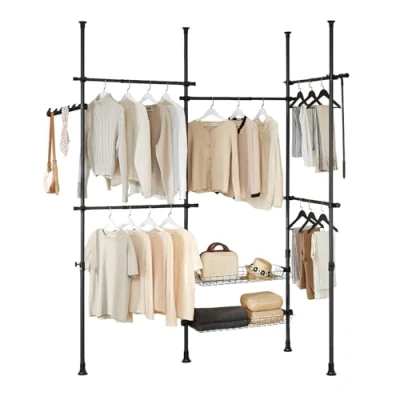 [PRODUCT INFORMATION] Made from durable metal tubes and sturdy plastic connectors. Dimensions: W(209–311) x H(200–295)cm. Weight: 9.1kg. Load capacity: up to 65kg. Package size: L93 x W23 x H15cm [VERSATILE TELESCOPIC CLOTHES RAIL SYSTEM] Featuring 4 adjustable poles, 5 hanging rails (4 extendable) and 2 baskets, allowing you to create a customizable open wardrobe. Perfect as a heavy duty clothes rail for bedrooms or walk-in closets without permanent installation [HEAVY DUTY CONSTRUCTION AND FLEXIBLE APPLICATION] The sturdy metal frame supports up to 65kg as a reliable clothes hanging rail. The telescopic width (209–311cm) and height (200–295cm) easily adjusts to fit any room layout [CLOSET ORGANIZER WITH HANGING HOOKS] Includes a side-mounted garment hook for hats, coats, ties, scarves, and bags - perfect for maximizing storage in compact spaces [EASY NO-TOOLS ASSEMBLY] Arrives in a compact flat-pack with clear illustrated instructions for quick setup. This clothes rack keeps your room tidy and clean without scratching or damaging the walls or ceiling