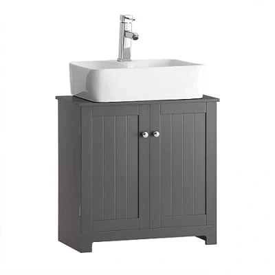 [Spacious Storage & Adjustable Shelf]: This under sink bathroom cabinet provides generous under sink storage with a height-adjustable shelf – ideal for storing towels, toilet rolls, and everyday toiletries. A practical bathroom cupboard that fits easily into compact or modern spaces [Moisture-Resistant & Easy-to-Clean Material]: Crafted from durable E1 MDF with a smooth lacquered finish, this bathroom sink cabinet resists humidity and is easy to wipe clean – perfect for use as a long-lasting bathroom storage unit [Magnetic Doors for Clean Look]: The cabinet features two doors with a magnetic closure system, preventing unwanted openings and keeping your bathroom under sink storage cabinet looking neat and tidy at all times [Part of a Coordinated Bathroom Set]: Match this bathroom under sink cabinet with other SoBuy furniture pieces - bathroom tall cabinet(BZR17-DG, BZR104-DG), toilet cabinet (BZR106-DG), owall unit (BZR19-DG) and laundry cabinet(BZR33-DG) – ideal for a fully coordinated bathroom setup [Easy Assembly with Instructions Included]: Supplied with detailed assembly instructions and all necessary fittings, this under sink storage cabinet can be built easily and quickly. Please note: basin is not included