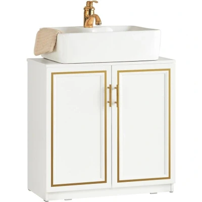 General description With this under sink cabinet, maximizing space in your bathroom becomes easier. The cupboard is spacious enough to ensure ample storage for all your bathroom essentials, featuring two compartments behind the doors to maximize storage space. The 'U' shaped cut-out slots allow it to fit easily underneath your sink (please measure before purchasing). Made of high-quality MDF in white lacquer, this cabinet features golden screen printing on the door panels and matching golden door handles, giving it a unique and fashionable look. This space-saving storage solution will help keep your bathroom tidy and organized. Technical specifications Material: MDF Dimensions: W60 x D30 x H61 cm Weight: 10.4 kg Load capacity: 25 kg Installation Item comes in a flat pack and requires self-assembly Detailed instructions supplied Other information The basin is NOT included in the delivery The decorative elements are not included in the delivery